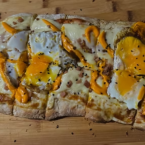 pizza muzarella con huevos fritos cheddar y panceta