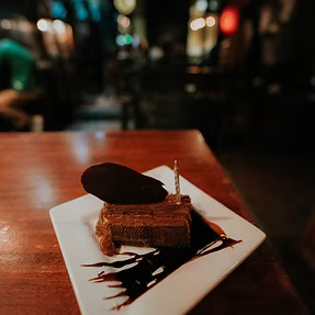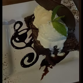 brownie de chocolate con helado de crema y salsa de chocolate