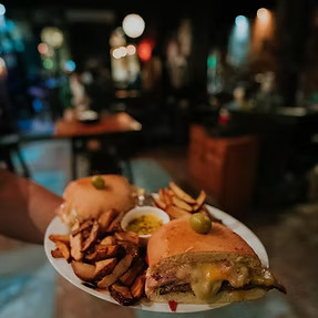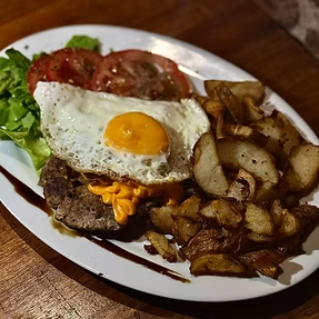 hamburguesa al plato con, cheddar, panceta, huevo frito, rúcula, cherry y mayonesa. Acompañado con papas rusticas