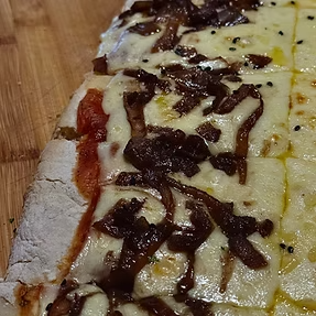 pizza muzarella con cebolla caramelizada