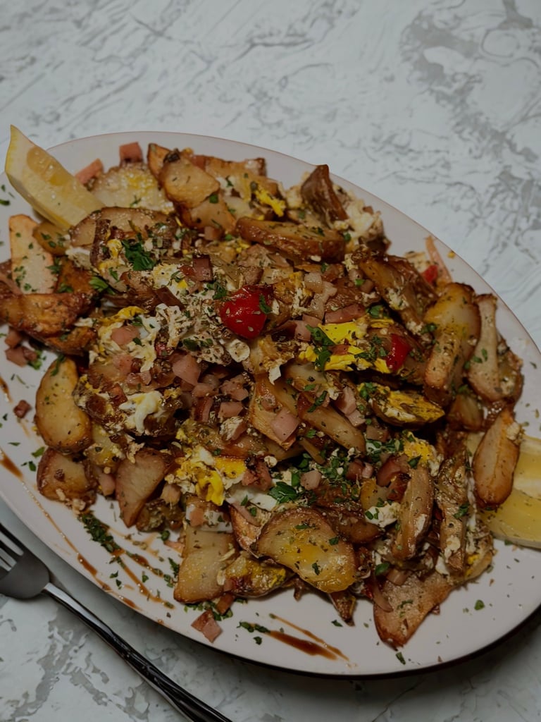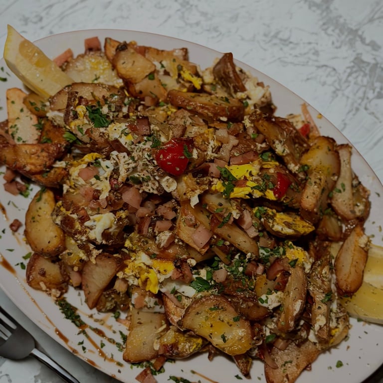 morrón rojo y verde, cebolla, jamón, huevo y papas rusticas